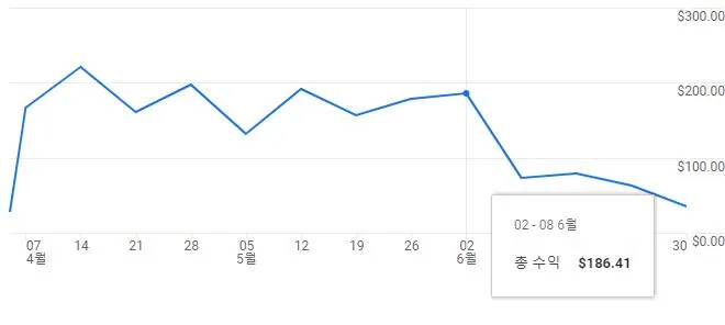 수익 그래프를 보면 6월 첫째 주까지는 수익이 높다가 둘째 주부터 급격하게 하락하는 것을 볼 수 있습니다. 비슷하게 4월 7일 이전에도 수익이 굉장히 밑에 있는 것을 볼 수 있습니다.