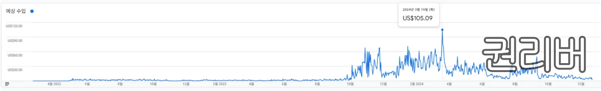 그러던 2023년 10월, 한 달 동안 700달러를 벌었고, 2024년 3월에는 일 105달러를 벌기도 하였습니다. 그러나 2025년 1월 현재는 월 100달러 수준으로 급감하였는데요.