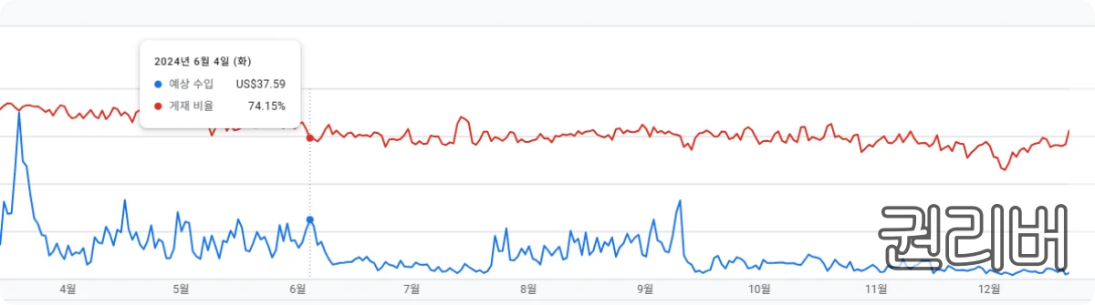 그러나 2024년 6월, 수익이 급감하는 시기부터는 게재 비율이 80%는커녕 70% 밑으로 내려가는 일이 발생하기 시작합니다. 그리고 2024년 9월 중순을 끝으로 더 이상 일 30달러 이상의 수익은 나오지 않고 있는데요. 신뢰도가 너무나 낮아져서 광고 게재도 되지 않고, 클릭당 단가도 엄청나게 하락했습니다.