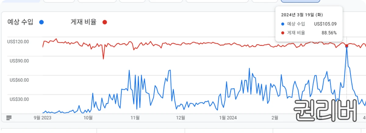 위 사진은 2023년 9월부터의 애드센스 수익입니다. 신뢰도가 높았던 당시에는 수익도 높았고, 광고 게재 비율도 굉장히 높았는데요. 아무리 낮아도 80% 후반을 기록하였습니다.