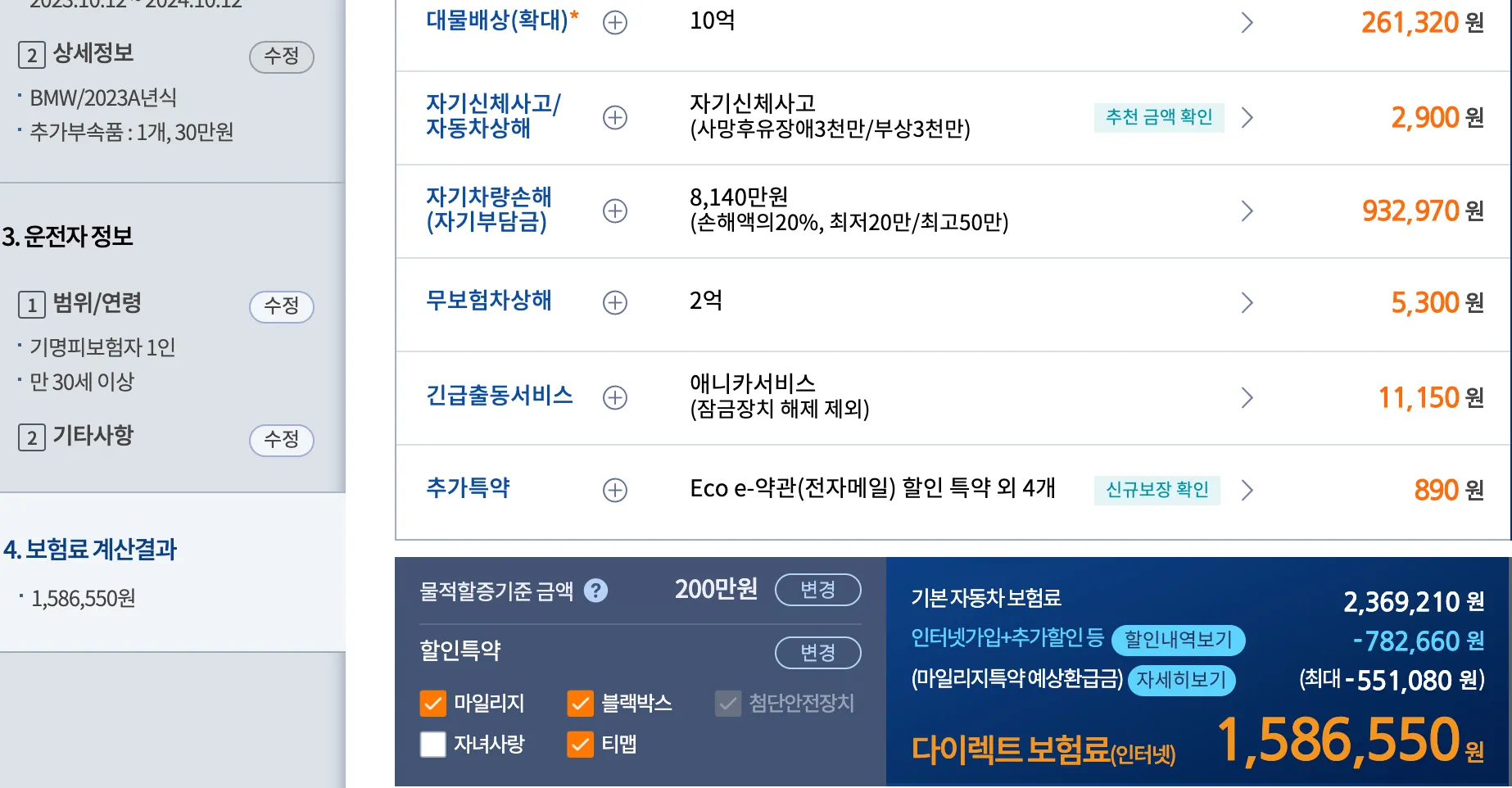 | 삼성화재 다이렉트 자동차보험 할인 특약 정보 (주행거리, 티맵, 자녀, 나눔 친서민 최대 32% 할인 ) (0) | 2023.10.12 |